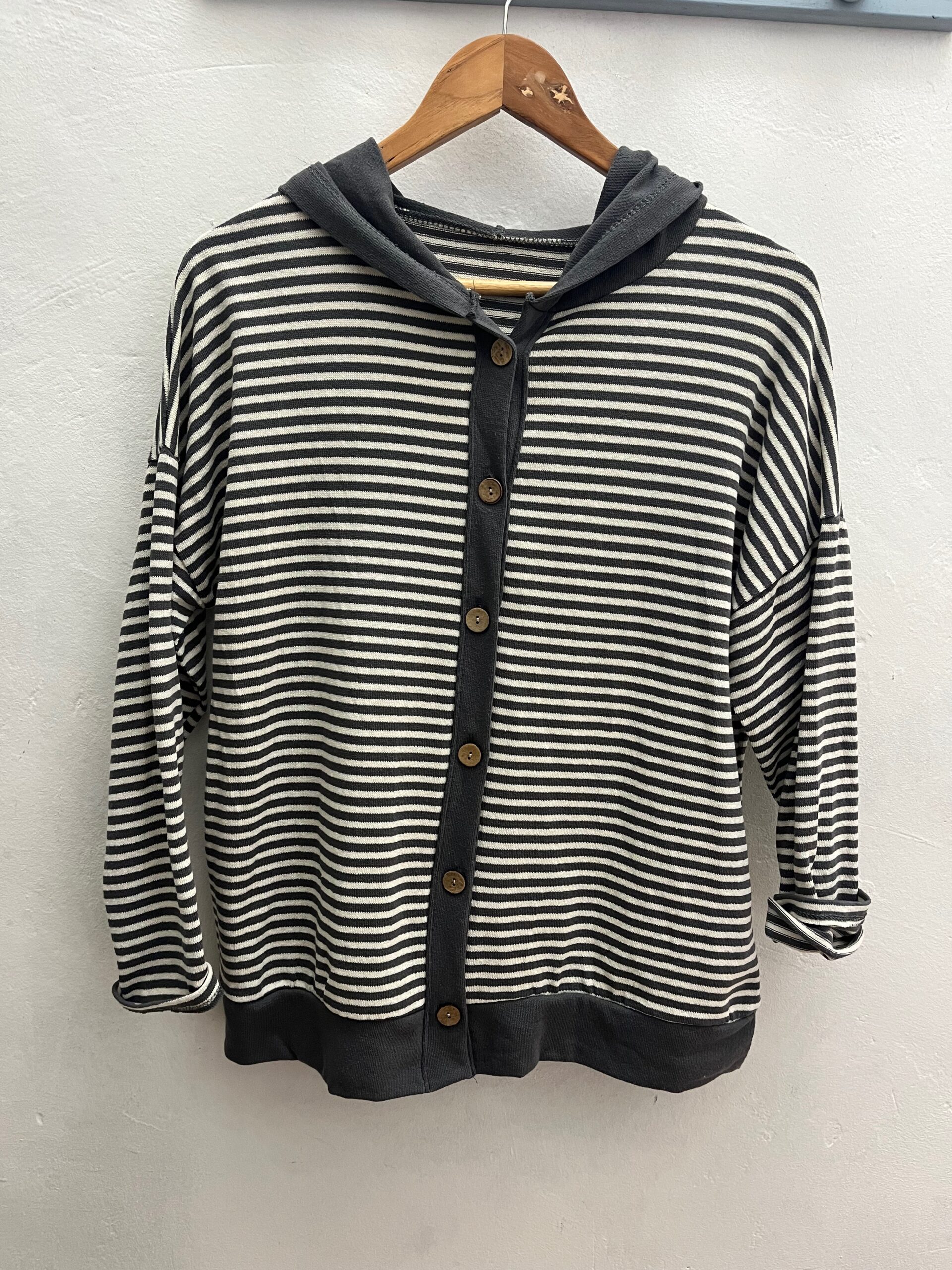 Chaqueta abotonada con capucha. Estampado a rayas. Color gris marengo